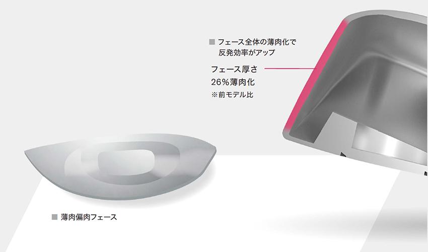 高強度のC300マレージング鋼と薄肉フェース設計により、反発性能が前モデル比で10%向上。 フェース全体の反発効率が高まり、飛距離アップを実現します。