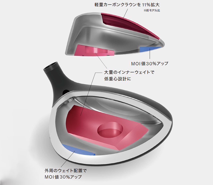 大量のインナーウェイトと重心設計の最適化により、横方向の慣性モーメントが30%アップ。打点ブレに強く、安定した弾道をサポートします。