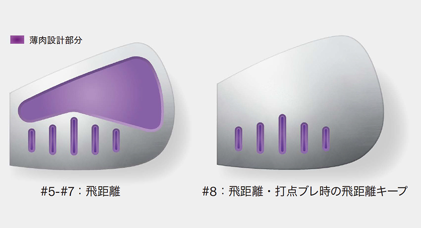 番手の役割に応じてフェース裏面を精密加工により偏肉化。 ロング番手はフェースを最大限薄くし、飛びをサポート。ミドル番手は打点ブレに強く、グリーンを正確にとらえます。